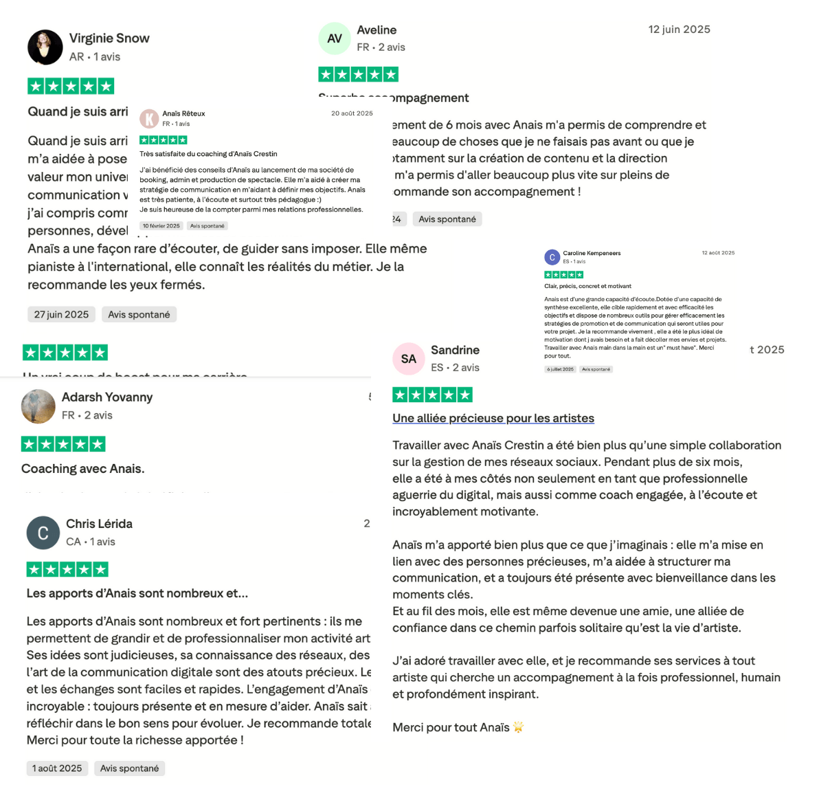 Fondatrice de la méthode CREA et du symposium international de masterclasses et conférences en ligne Music Art & Connect, elle aide les artistes à clarifier leur projet, structurer leur carrière et développer leur visibilité.